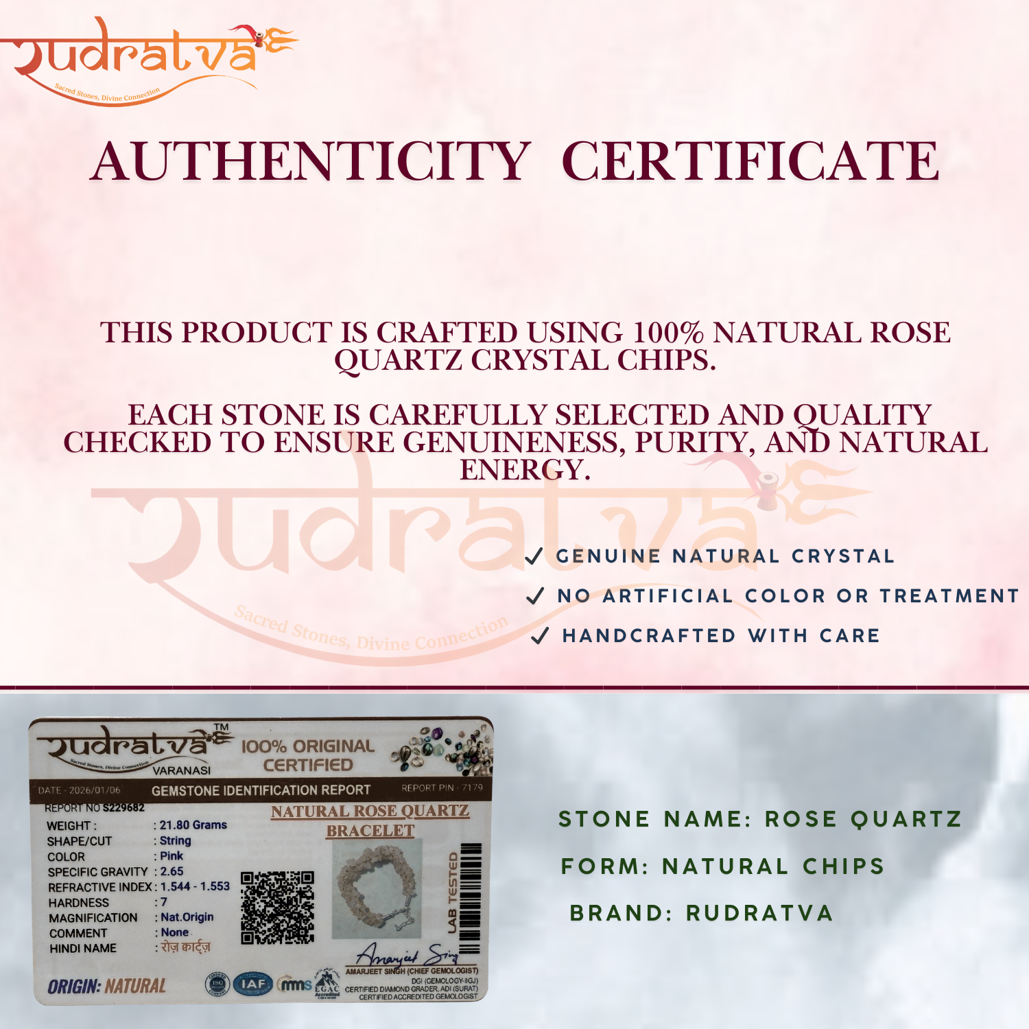 At Rudratva, each bracelet is carefully handcrafted to ensure comfort, durability, and positive energy. The gentle pink hues of rose quartz make it perfect for daily wear while supporting calmness, peace, and heartfelt connections.